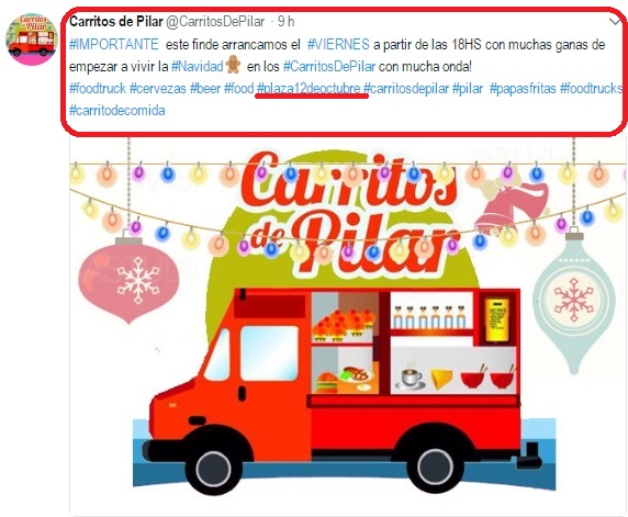 «#IMPORTANTE este finde arrancamos el #VIERNES a partir de las 18hs con muchas ganas de empezar a vivir la #Navidad en los #CarritosDePilar con mucha onda! #foodtruck #cervezas #beer #food #plaza12deoctubre #carritosdepilar #pilar #papasfritas #foodtrucks #carritodecomida», es el anuncio a través de la cuenta de Twitter @CarritosDePilar.
