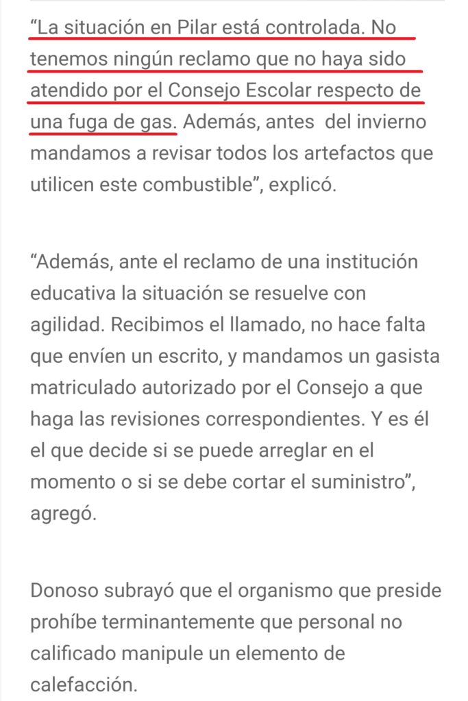 Nadie olvidará que bajo la gestión de Donoso como Presidente del Consejo Escolar las escuelas estuvieron cerradas por un mes, o más, en el 2018 por las fallas en las instalaciones de luz y gas. «La situación en Pilar está controlada. No tenemos ningún reclamo que no haya sido atendido», manifestó cuando le consultaron luego de la tragedia de Moreno que se cobró dos vidas. Posterior a sus palabras, decenas de edificios cerraron sus puertas y los alumnos perdieron semanas e incluso meses de su educación. «Junto con el Gobierno de la Provincia renovamos las instalaciones de gas de las escuelas», había remarcado ¿»Pinocho»? Donoso.