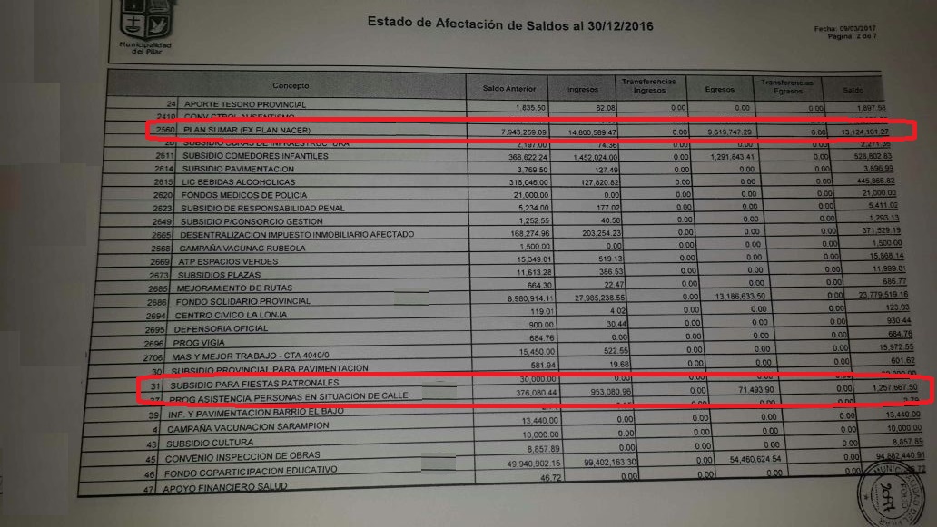 La economía de la Comuna no sólo se nutre de la recaudación propia, sino también de programas nacional y provincial como lo es el Plan Sumar (ex Plan Nacer). El mismo es un proyecto de inversión en salud materno infantil que brinda cobertura de salud a embarazadas, puérperas hasta 45 días y niños/as menores de 6 años que no tienen obra social y tiene como finalidad disminuir los índices de morbimortalidad materno infantil, fortaleciendo la red pública de atención primaria de la salud. Increíblemente en Pilar no se ofreció ese beneficio para ese sector de la sociedad, o por lo menos, no en la cantidad que se podía. Ducoté contó con $22.743.848 y solamente utilizó $9.619.747. En medio de una realidad nacional, no sólo local, que muestra que la pobreza ha crecido, ¿no hay embarazadas en el distrito que necesiten esta ayuda? ¿No existen menores de 6 años sin cobertura social para haber utilizado más de $13 millones?