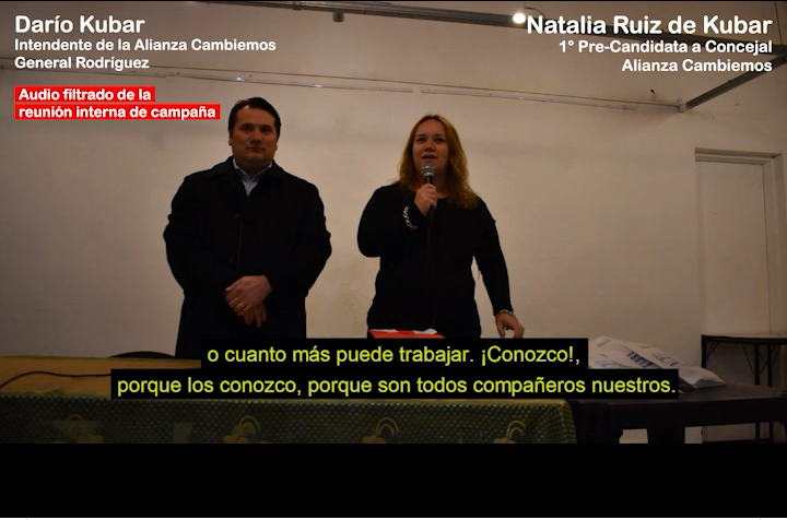 Conocida como la «ñoqui VIP», Natalia Ruiz transita sus días conduciendo los destinos de su distrito, General Rodríguez, junto a su esposo, el Intendente Darío Kubar. Mientras tanto, continúa cobrando un sueldo de la comuna que lidera Nicolás Ducoté. Tanto la «empleada» como el jefe comunal, sólo produjeron una ficción por un tiempo, teniéndola ocupada en la Dirección de Hidráulica y luego volvieron al acuerdo original; que cobre sin trabajar. Esa situación sigue hasta el día de hoy. Ahora la señora vuelve a ser noticia, ya que se filtró un audio donde ella junto a su pareja adoctrinan a sus funcionarios/militantes con el manual de campaña de Cambiemos que recorre toda la provincia. Pilar Político reproduce las partes más interesantes (https://m.facebook.com/story.php?story_fbid=1824193577595749&id=1052072948141153).