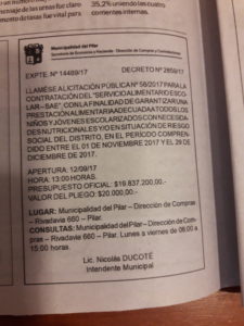 En julio del 2016, Pilar Político detalló como el Consejo Escolar avalaba que un proveedor propio, Padram, había dejado carne en mal estado para el comedor de la Escuela N°13. «Solamente se pincho el envasado al vacío por unos minutos, se podía cocinar igual», era la excusa que el tesorero Pablo Donoso expresada en diferentes medios locales. El pasado martes 12 se realizó la primera parte de la nueva licitación para la provisión de alimentos, ahora con el control del municipio. E increíblemente la firma que jugó con la salud de los chicos de Villa Rosa es uno de los oferentes, con grandes posibilidades de ganar. ¿Se dio cuenta Nicolás Ducoté que hay un sobre que viene con olor a podrido?
