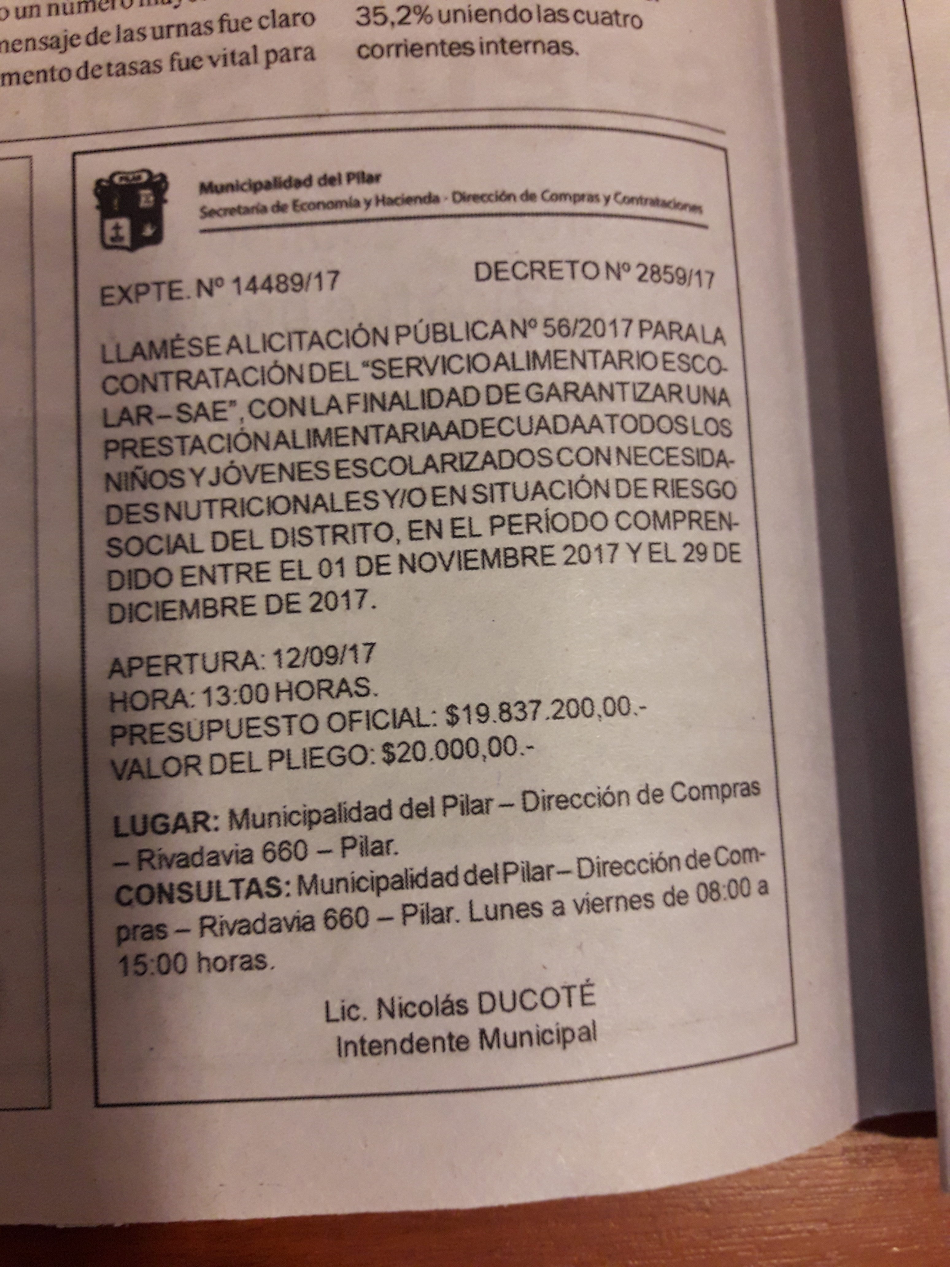 14/09/2017 | Ayer comenzó la licitación para la provisión de alimentos para los comedores escolares en la parte final del año. El ganador recibirá $20.000.000 por tan sólo dos meses. Nicolás Ducoté tomó el control del servicio dejando a un lado al Consejo Escolar. Entre los postulantes aceptaron a Pradam, la firma que fue denunciada por llevar carne en mal estado a la Escuela N°13 de Villa Rosa.