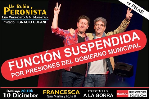 13/12/2017 | Gustavo Berger denunció que su obra "Un Rubio Peronista" fue suspendida por presiones de inspectores municipales a los propietarios del lugar de su presentación, "Francesca". "Es una tristeza enorme", expresó el artista en su muro de Facebook.