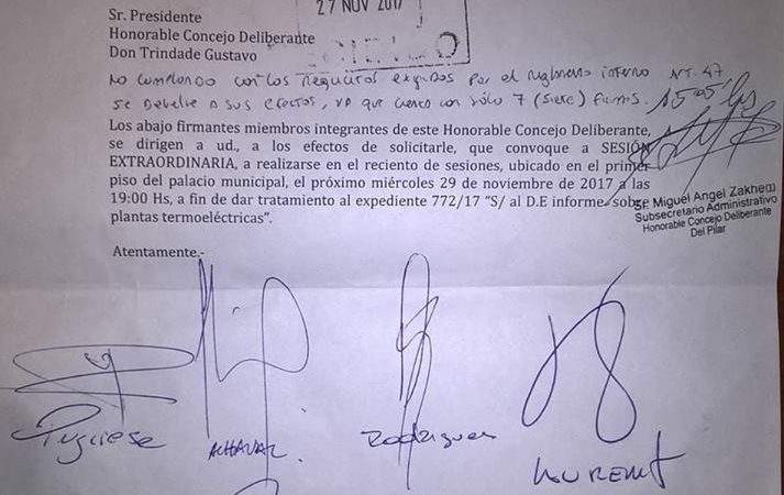 28/11/2017 | Sólo siete concejales firmaron la convocatoria para la sesión extraordinaria que iba a tratar la suspensión del inicio de actividades de las centrales termoeléctricas en Villa Rosa. Todo el oficialismo junto al Frente Renovador decidieron no acompañar el pedido. ¿Lo harán en la próxima sesión? ¿O la postura es coincidir con el Intendente Nicolás Ducoté?