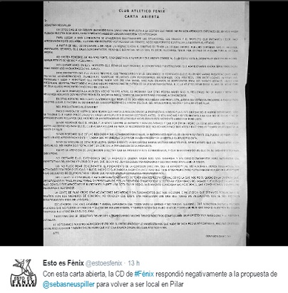 06/12/2016 | La Comisión Directiva de Fénix publicó una carta abierta dirigida a Sebastián Neuspiller. Allí expusieron que no recibieron apoyo de la comunidad pilarense y por ello se llevaron a la institución. “La gente de Pilar creyó esas acusaciones mediáticas que nos hicieron”, expresaron.