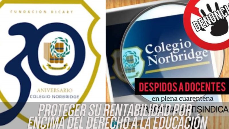 03/06/2020 | Docentes de los colegios de la Fundación Ricart se reunieron para tratar el despido de colegas en Norbrigde College. Alrededor de veinte personas no cobrarán sus haberes desde el 1° de junio. Esto ocurre en un establecimiento donde los padres padres pagan un promedio de $30.000 de cuota mensual. "Hay desprecio por la educación" indicaron desde el gremio SADOP.