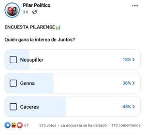 Al igual que otros sondeos previos en Pilar, la encuesta realizada por Pilarpolitico.com.ar marcó una clara tendencia hacia un triunfo de los postulantes de Patricia Bullrich en la interna local de Juntos. Los números fueron aplastantes sobre el precandidato larretista Sebastián Neuspiller.