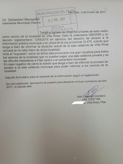 A través de la ventanilla de mesa de entrada, Giordano dejó una nota solicitando información sobre el estado de la sala velatoria municipal de Villa Rosa. “Según notas periodísticas, vecinos y algunos empleados municipales, dicha sala fue cerrada por decisión de la actual gestión municipal”, manifestó en el documento ingresado.