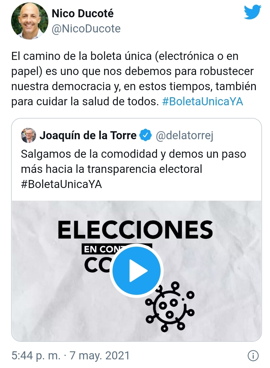 Durante su última aparición en las redes sociales, el ex Jefe Comunal macrista apoyó una iniciativa de su ex colega de San Miguel, Joaquín de la Torre. Se trata de la implementación de la boleta única para las elecciones de este año. Propuesta que han hecho otros en Juntos por el Cambio, pero Ducoté decidió encolumnarse detrás de De la Torre y Miguel Ángel Pichetto para apoyarla. Todo una señal, en lo que se refiere a la búsqueda de padrinazgos de cara a septiembre.