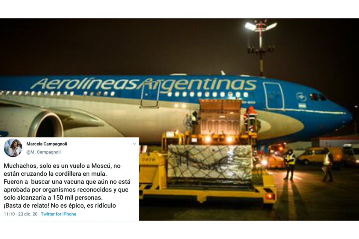 «Muchachos, solo es un vuelo a Moscú, no están cruzando la cordillera en mula. Fueron a buscar una vacuna que aún no está aprobada por organismos reconocidos y que solo alcanzaría a 150 mil personas. ¡Basta de relato! No es épico, es ridículo» fueron las palabras utilizadas por la Diputada Nacional para referirse al vuelo de Aerolíneas Argentinas que fue en busca de las primeras dosis de la vacuna Sputnik V que genera la esperanza de comenzar a erradicar al COVID-19.