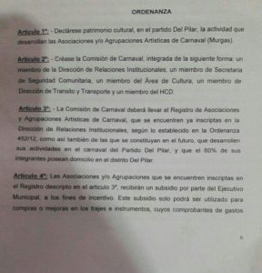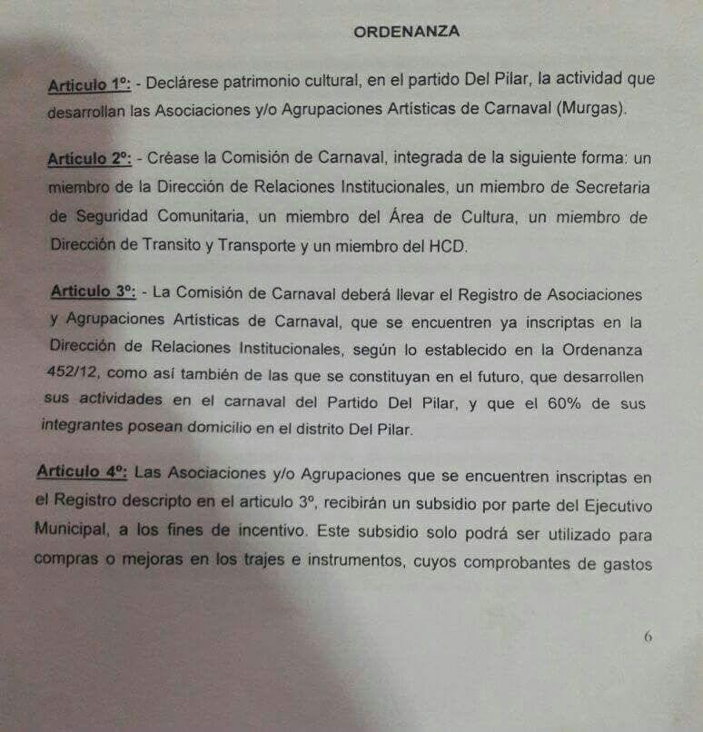 Artículo 1°: Declárese patrimonio cultural, en el partido Del Pilar, la actividad que desarrollan las Asociaciones y/o Artísticas de Carnaval.