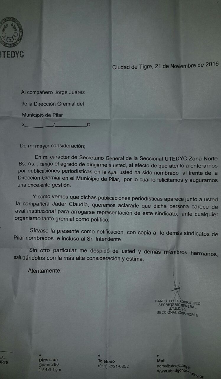 Esta iniciativa también tiene en la mira al actual Secretario de Desarrollo Político local, Carlos Arena. Apuntado por estos dirigentes por haber incluido a Jorge Juárez en el gabinete de Nicolás Ducoté. “No tienen representatividad real en Pilar”, aseguran y colocan como ejemplo una carta enviada desde UTEDYC central. En la misma, el Secretario General de Zona Norte Daniel Félix Rodríguez, aclara que Claudia Jader carece aval institucional para representar al gremio en la Dirección Gremial liderada por Jorge Juárez.