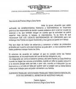 «Ante la grave situación que están sufriendo los establecimientos Hoteleros y Gastronómicos es imperioso pedirles a los responsables de decidir cuando podemos abrir o cerrar o quién es esencial o no, que también tengan en cuenta que la actividad no podrá soportar más cierres, ni totales, ni intermitentes. Ya es hora de que reconozcan QUE LOS LOCALES GASTRONÓMICOS NO CONTAGIAN pero sin embargo más pymes se siguen fundiendo y más gente se queda sin trabajo» indicó Agüero en su comunicado.