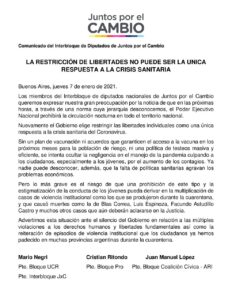 Primero solicitaron desesperadamente que se cierren las escuelas, despues estuvieron en contra de la cuarentena obligatoria, también generan temor por la llegada de la vacuna SPUTNIK V, ahora marcan disconformidad con las restricciones nocturnas, los dirigentes de Juntos por el Cambio parecen tener un único objetivo: contar muertes para regresar al poder.