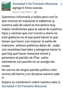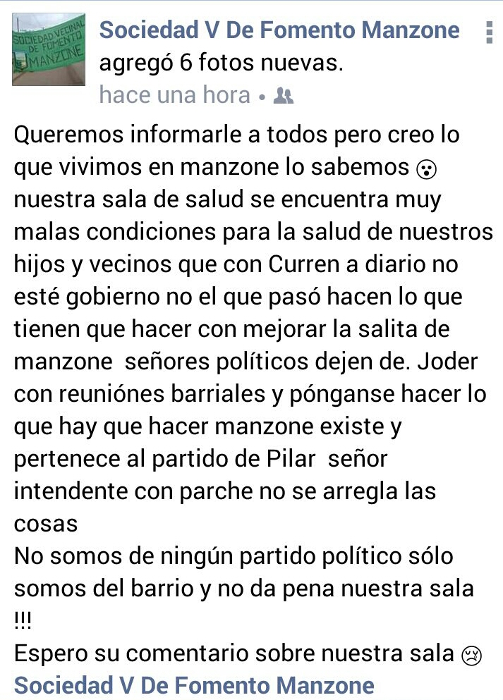 «Queremos informales a todos, pero que los que vivimos en Manzone lo sabemos. Nuestra sala de salud se encuentra en muy malas condiciones para la salud de nuestros hijos y vecinos que concurren a diario. Ni este gobierno, ni el que pasó hacen lo que tienen que hacer para mejorar la salita. Señores políticos, déjense de joder con reuniones barriales y pónganse a hacer lo que hay que hacer. Manzone existe y pertenece al partido de Pilar. Señor Intendente, con parches no se arreglan las cosas.