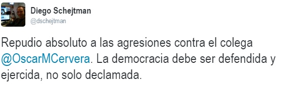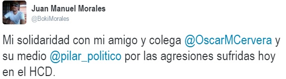 Medios como Radio X Pilar, FM Estudio 2, Pilar Hoy, Country Pilar, entre otros expresaron su repudio a lo sucedido. También lo hicieron colegas locales como Juan Manuel Morales, Sergio Abrate, Diego Schejtman, Javier Pagani, el delegado local de UTPBA Alejandro Benedetti, María Fernanda Ipata, Federico Cué Barberena, Marcos Bertolino, Nicolás Mouler, Miguel Trezza, quienes todos coincidieron con la frase de Schejtman: “La democracia debe ser defendida y ejercida, no sólo declamada”.