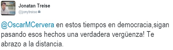 Desde la Patagonia envió su mensaje uno de los deportistas más destacados de Par, Jonatan Treise. “En estos tiempos de democracia, que sigan pasando estos hechos ¡es una vergüenza! Te abrazo a la distancia”, fueron las palabras del basquetbolista hacia el responsable de este medio. Representante al sector gremial, el Secretario General de UDOCBA Pilar repudió lo sucedido.