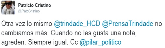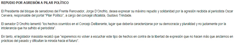 Por el lado de la clase política, fueron innumerables los llamados y mensajes de solidaridad. Incluyendo a representantes de Cambiemos, espacio que trabaja en conjunto con Trindade, como por ejemplo el Secretario de Gobierno Diego Ranieli. También lo hizo el concejal Daniel Liberé a través de una carta en muro de Facebook. Sumado a ellos, infinidad de mensajes vía Twitter, y también con un llamado telefónico y un comunicado, el Senador provincial Jorge D’Onofrio quien lamentó “los hechos ocurridos en el Concejo Deliberante, lugar que debería caracterizarse por su democracia y pluralidad, y no justamente por la intolerancia que ha sufrido el periodista”.