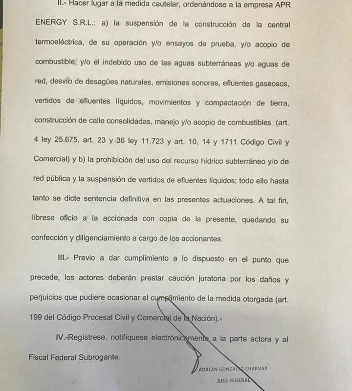 «Hacer lugar a la medida cautelar, ordenándose a la empresa APR Energy S.R.L: a) la suspensión de la construcción de la central termoeléctrica, de su operación y/o ensayos de prueba y/o acopio de combustible, y/o el indebido uso de las aguas subterráneas y/o aguas de red, desvío de desagües naturales, emisiones sonoras, efluentes gaseosos, vertido de efluentes líquidos, movimiento y compactación de tierra, construcción de calles consolidadas, manejo y/o acopio de combustibles; b) la prohibición del uso del recurso hídrico subterraáneo y/o de red pública y la suspensión de vertidos de efluentes líquidos; todo ellos hasta tanto se dicte sentencia definitiva en las presentes actuaciones», es el resumen del fallo del juez.