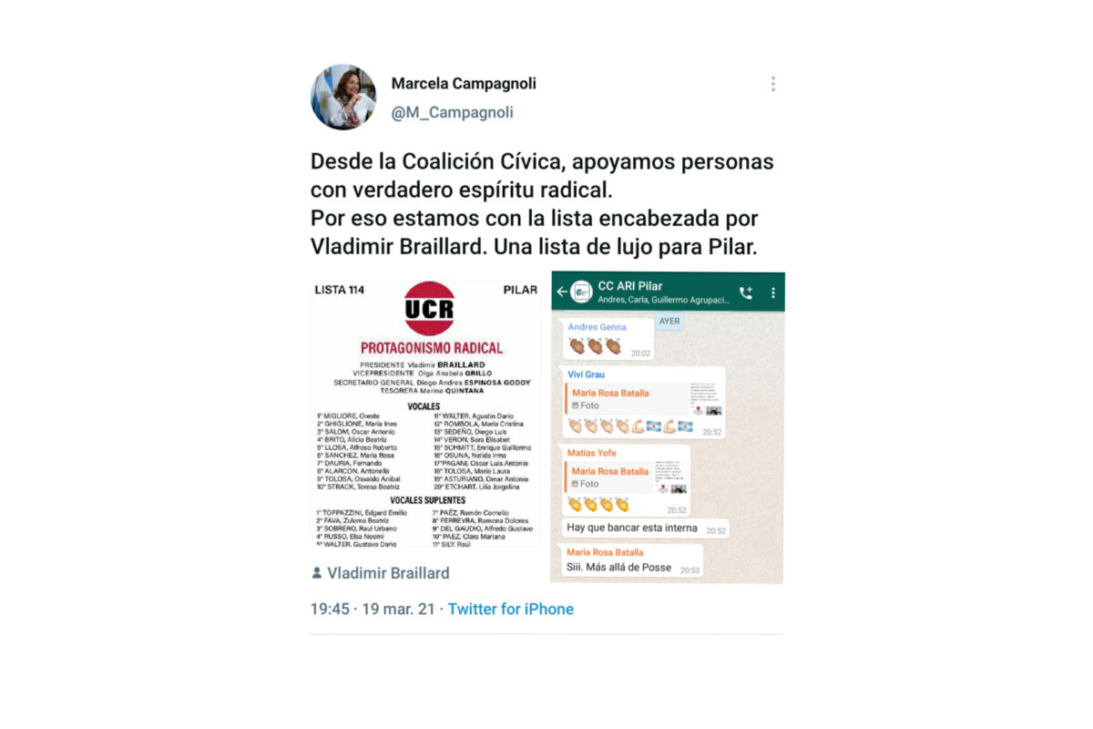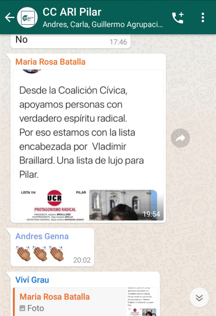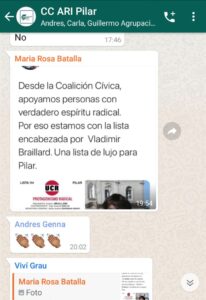 «Hay que bancar esa interna» expresaba el Profesor de canto Matías Yofe en el grupo de WhatsApp de la CC ARI en referencia al apoyo de Campagnoli a Braillard. Coincidía el resto, con la salvedad de María Rosa Batalla: «Siii. Más allá de Posse». Justamente el actual Intendente de San Isidro fue el único que ganó en el distrito de esa lista.