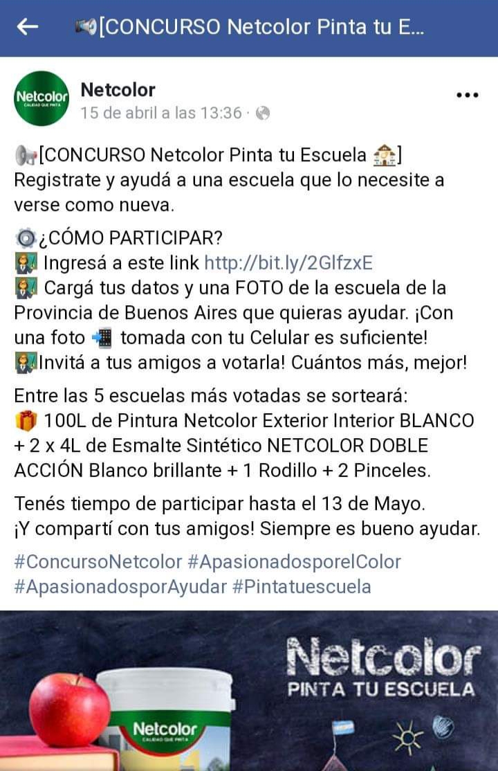 La empresa NetColor organizó un sorteo para pintar una escuela de la provincia de Buenos Aires. Para ganar debían ingresar al sitio de la empresa y votar entre todas las anotadas. El premio era 100 litros de pintura interior, 8 litros de esmalte sintético, 1 rodillo y 2 pinceles. La votación se cerró el pasado lunes 13 de mayo y los chicos de Pilar no pudieron acceder a ese premio que tanto deseaban.