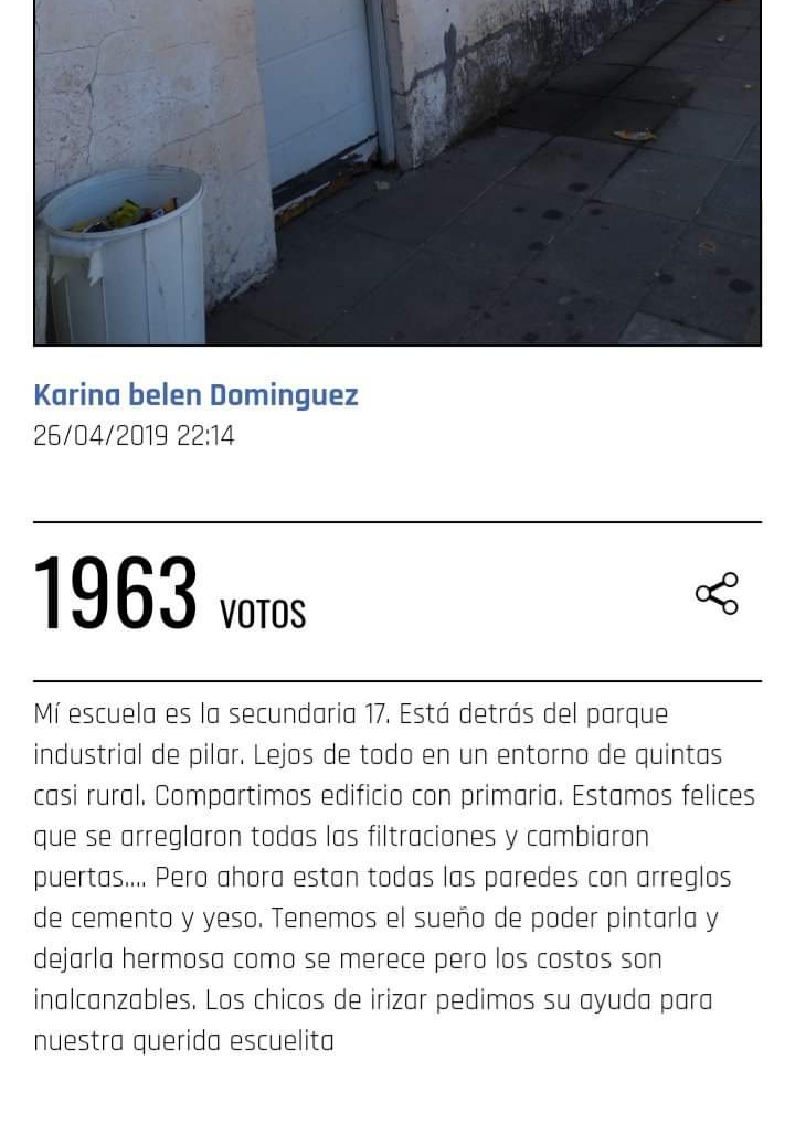 «Mi escuela es la Secundaria 17. Está detrás del Parque Industrial de Pilar, lejos de todo, en un entorno de quintas, casi rural. Compartimos edificio con Primaria», esa fue la presentación que realizó Karina Belén Domínguez para que todas las familias de la comunidad educativa, y quien quiera, los elijan para ganar. «Estamos felices que se arreglaron todas las filtraciones y cambiaron puertas. Pero ahora están todas las paredes con arreglos de cemento y yeso. Tenemos el sueño de poder pintarlas y dejarla hermosa como se merece pero los costos son inalcanzables. Los chicos de Irizar pedimos su ayuda para nuestra querida escuelita», expresó.