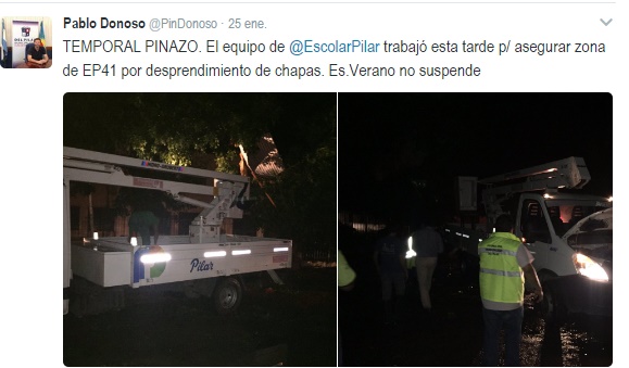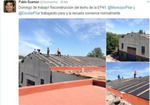 Luego de aquellos tuits de representantes del gobierno local, como el del Tesorero del Consejo Escolar, Pablo Donoso, en la noche del 24 de enero, no hubo apariciones públicas en el lugar hasta hace tan sólo unos días. Casi un mes después, el arquitecto Pablo Guzmán, demostró el retraso de la obra expresando: “Domingo de trabajo! Reconstrucción del techo de la EP 41”. En la imagen se observa como recién se estaba colocando el ruberoid, muy característico en el paisaje de la zona en las casas que se quedaron sin chapa y sólo pudieron colocar ese material.