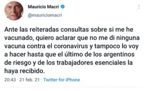 La confirmación contrasta con la propia palabra del expresidente de no vacunarse hasta que las personas de riesgo y los esenciales hayan recibido su dosis. En el mes de febrero, ante la persistente duda respecto a si había recibido la vacuna o no, el líder de Juntos por el Cambio había aclarado que aún no se había vacunado y agregaba: «Tampoco lo voy a hacer hasta que el último de los argentinos de riesgo y de los trabajadores esenciales la haya recibido».