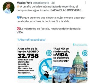 «A un año de la ley más nefasta de Argentina, el compromiso sigue intacto: SALVAR LAS DOS VIDAS» así el Profesor de canto del ex Intendente PROCESADO Nicolás Ducoté, Matías Yofe reabrió el conflicto interno de Juntos que se generó a partir del debate de la Ley de Interrupción Voluntaria del Embarazo. Esa discusión que dividió las aguas en el macrismo, como no lo hizo en el peronismo.